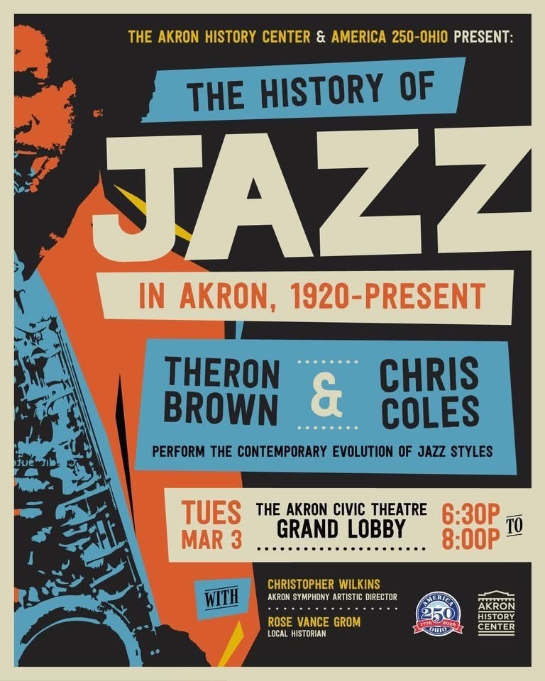 The Akron History Center, downtown Akron’s tribute to the city’s 200- year history will collaborate with “America 250-Ohio,” the Ohio Commission for the U.S. Semiquincentennial, to sponsor “The History of Jazz in Akron, 1920-present” on Tuesday, March 3, in the Grand Lobby of The Akron Civic Theatre, 6:30PM – 8:00PM.